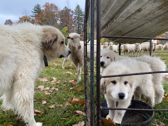 I picked up two Great Pyrenees puppies in Lake Placid on Monday, made a pit stop at Dr. Martha’s house to get them their shots, and took them straight to the flock. They are twelve weeks old, dense balls of fast-growing cuteness with fluffy white coats. Since Miranda went with me on the drive, she got naming rights. The male is Apollo and the female is Artemis. There is a lambing jug in the field for them to eat their meals in, but they are doing well loose in the flock and are very respectful of the electric fence. Captain, the four-year-old Great Pyrenees/Anatolian that arrived from Maine last week, seems skeptical of their utility, or maybe just not sure what he’s supposed to do with them. The chore team has found him outside the sheep fence a few times since they arrived, as if in protest. The pups will be moving around a bit in the next few weeks, to get them used to all the stock we will want them to guard while their little puppy brains are still malleable and the window for bonding is wide open.