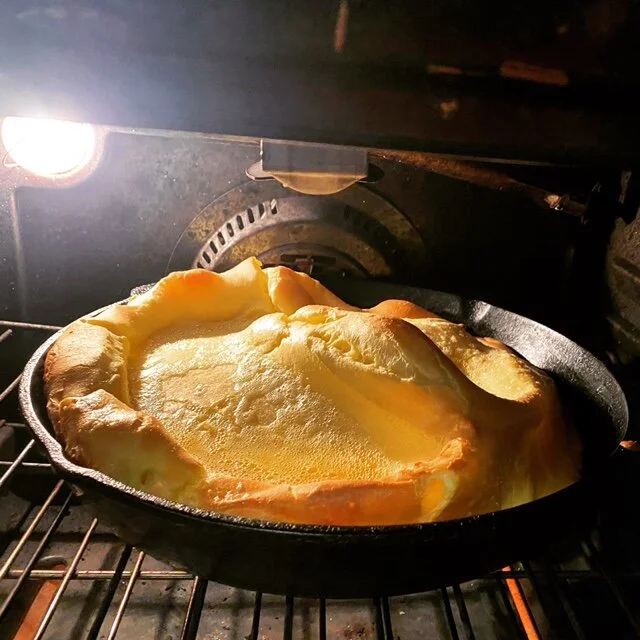 We are longtime fans of the Dutch baby around here. It is versatile, so easy, and when it comes out of the oven, puffed up high and brown, it never fails to delight. I’ve written about it before but if you’re new to it, think giant popover, or a yorkshire pudding without the roast. Most Dutch baby recipes out there veer to the sweet side, with sugar in the batter and something fruity on top, but it’s much more versatile than that and goes well with herbs, sausages and cheeses, and can be served any time of day. I prefer to make it neutral (no sugar) and add whatever sweet or savory toppings float the boat. Our version is a thin batter with four ingredients -- flour, milk, eggs, salt -- cooked in a generous amount of ghee, which can withstand the high temperature it takes to get a good puff better than butter can. It’s a very flexible and forgiving dish. Over the years, I’ve started using more eggs for a more substantial outcome, but some people like it with more air less there. Because we are always voracious, we make it in a 12” cast iron skillet, but if you are using the standard 8” skillet, halve the recipe.